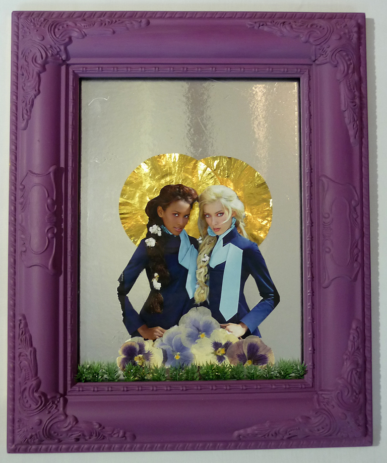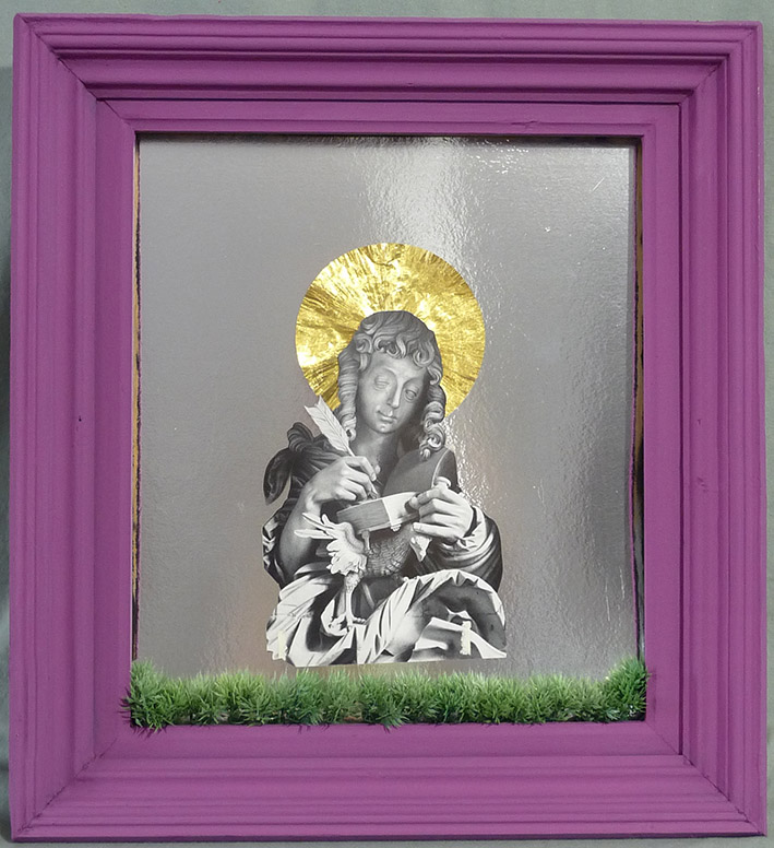 Bilderrahmen Holz, Alufolie, Acrylfarbe, Plastikgras, Fotocollage